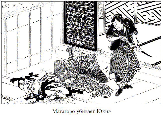 Когда Данъэмон понял, что его не только обманули, заставив отдать старуху, но и выставили на всеобщее посмешище, он разъярился и подумал было ворваться в дом и захватить Матагоро и его мать силой, но, заглянув во двор, увидел, что там полно хатамото, вооруженных мушкетами и обнаженными мечами.