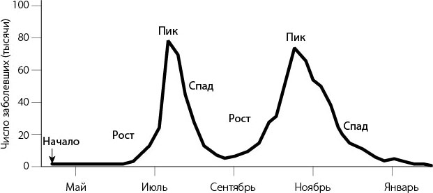 Для начала рассмотрим, как выглядит вспышка. Когда исследователи узнают о новой угрозе, первым делом они рисуют так называемую кривую вспышки – график, отображающий число новых случаев за единицу времени. Кривая может принимать разную форму, но обычно на ней видны четыре главные стадии: начало, рост, пик и спад. В некоторых случаях эти стадии могут повторяться несколько раз. Например, после того как в апреле 2009 года пандемия свиного гриппа дошла до Великобритании, заболеваемость быстро росла в начале лета и достигла пика в июле; через некоторое время рост возобновился, и новый пик пришелся на конец октября (далее мы разберемся, почему так произошло).