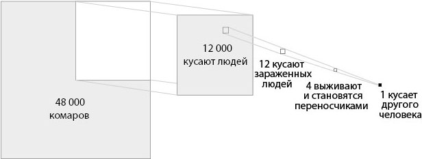На какое-то время Росс оставил эти интеллектуальные упражнения, но после открытия пути передачи малярии возобновил занятия математикой. На этот раз он нашел способ сделать свое хобби полезным для профессиональной деятельности. Перед ним стоял важнейший вопрос, требовавший ответа: возможно ли сдержать распространение малярии, не уничтожая всех комаров до единого? Чтобы выяснить это, Росс разработал простую концептуальную модель передачи малярии. Начал он с подсчета возможного числа новых случаев заражения в месяц на отдельно взятой территории. С этой целью он мысленно разделил процесс передачи болезни на несколько этапов. Для передачи инфекции, рассуждал он, необходимо, чтобы в данном районе был хотя бы один человек, зараженный малярией. В качестве примера Росс взял сценарий, при котором в деревне с населением 1000 человек болен всего один. Чтобы передать инфекцию другому человеку, комар Anopheles должен укусить зараженного. Росс подсчитал, что в среднем лишь одному из четырех комаров удается укусить человека. Таким образом, если в данной местности живет 48 тысяч комаров, то укусить людей смогут 12 тысяч из них. А поскольку изначально заражен только один из 1000 жителей деревни, его укусят (и получат вместе с кровью малярийного паразита) всего 12 комаров из 12 тысяч.