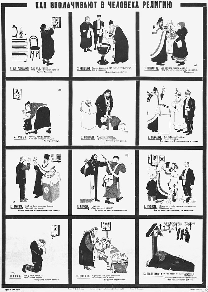 В принципе, народная религиозность – если она оставалась в секулярных рамках, установленных после революции, – не должна была восприниматься как проблема. Какое дело партии до того, есть ли в домах советских людей иконы, отмечают ли они Пасху и крестят ли своих детей? В конце концов, ни одна из этих религиозных практик не нарушала советских законов; напротив, свобода совести была в числе прав, предоставленных гражданам советской Конституцией. Но для партии секуляризация была не конечной целью революции, а лишь предварительным условием построения нового коммунистического строя. Поскольку религиозные учреждения утратили свою политическую и экономическую мощь, а люди были освобождены от влияния духовенства и обращены на путь просвещения, у большевиков не было сомнений, что массы придут к атеизму – особенно если партия будет направлять и ускорять этот процесс.