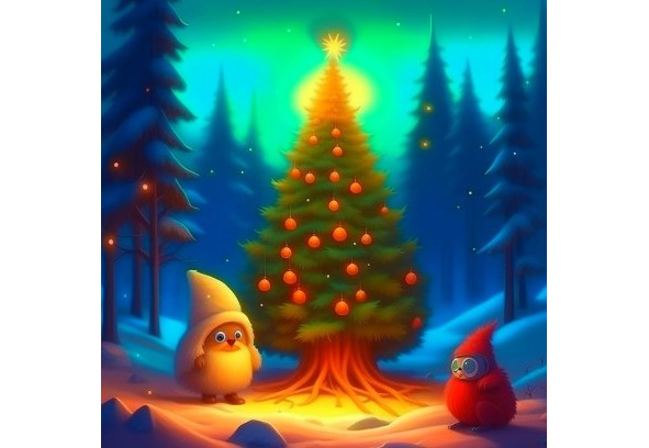 В самом центре лесной поляны красовалась роскошная высокая, стройная, пушистая и вечнозелёная Ёлка! Она была украшена новогодними игрушками и гирляндами.