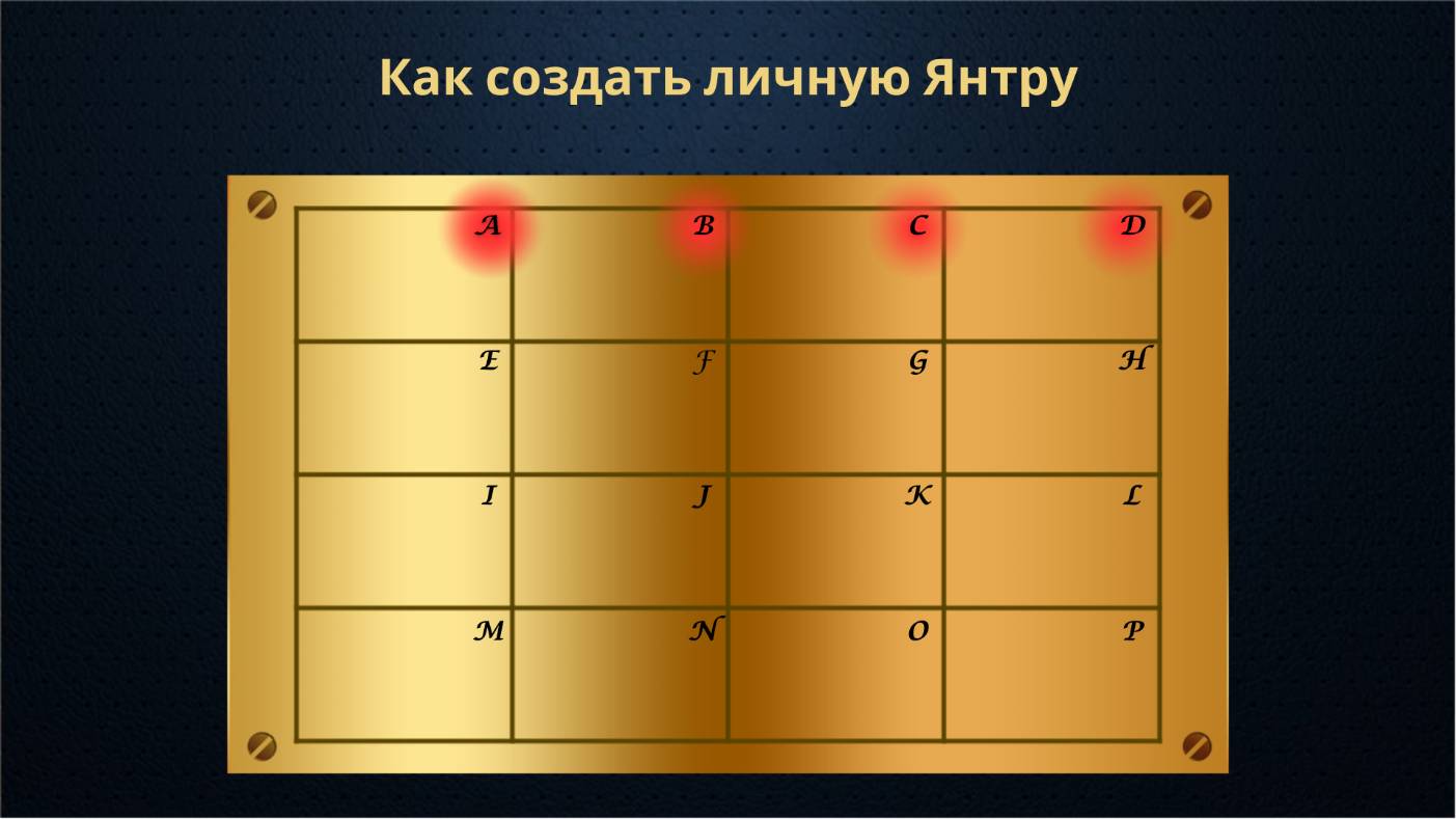 Первый ряд этого квадрата – исходные числа Янтры, где: