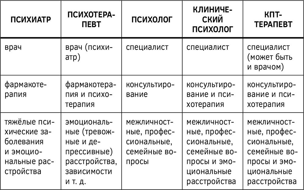 Для того чтобы прояснить ключевые отличия профессионалов, работающих с эмоциональными расстройствами, полагаем важным кратко охарактеризовать специфику деятельности каждого такого эксперта (см. табл. 1).