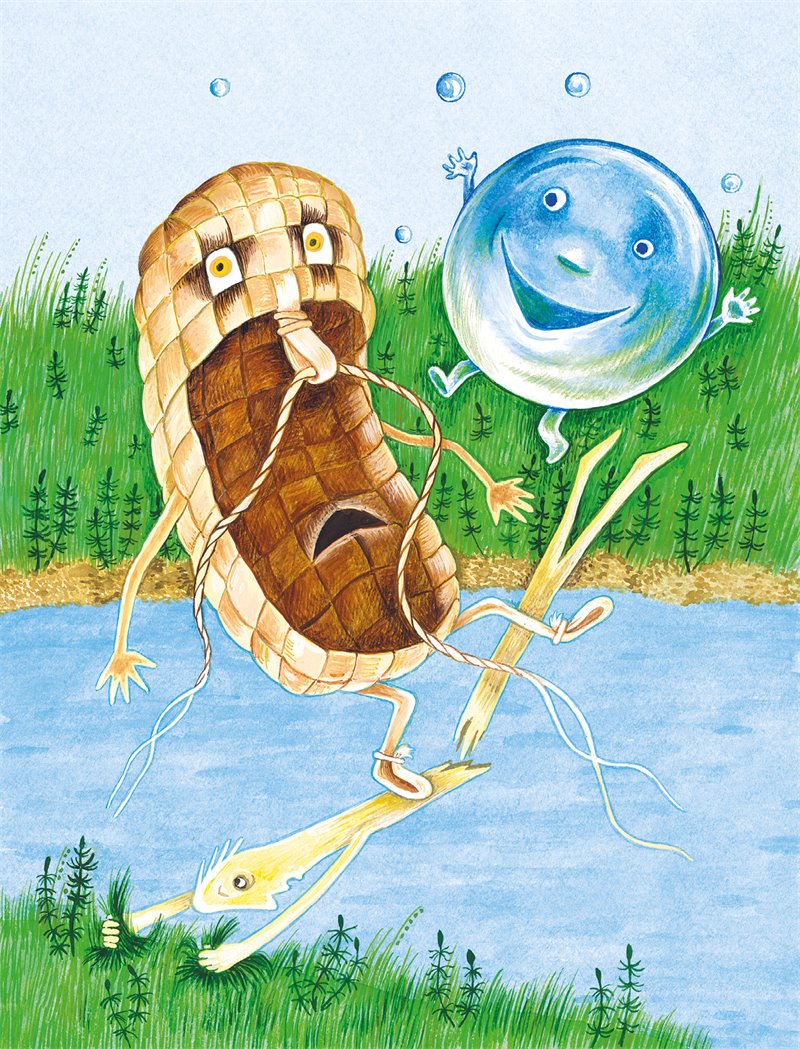 Первый пошёл по ней Лапоть. До середины шёл он благополучно, а тут вдруг Соломинка под ним как переломится!.. И полетел наш Лапоть в воду.