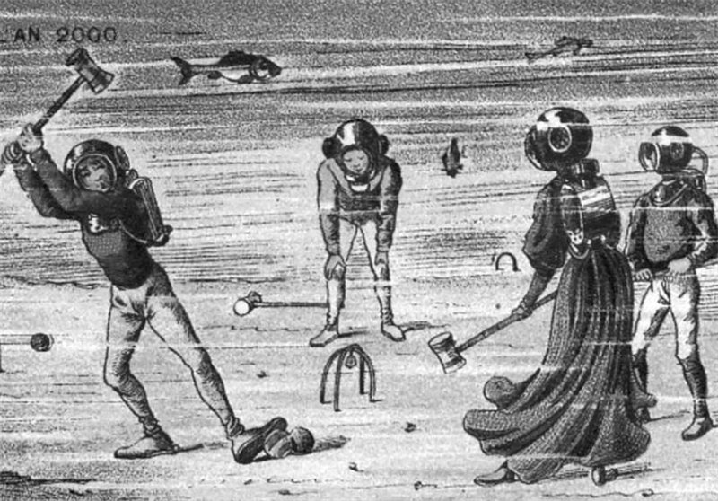 Карточка из серии «Мир будущего»: крикет под водой. Представить себе сложную аристократическую игру под водой авторам картинки проще, чем изменение длины юбки. Или исчезновение самой игры.