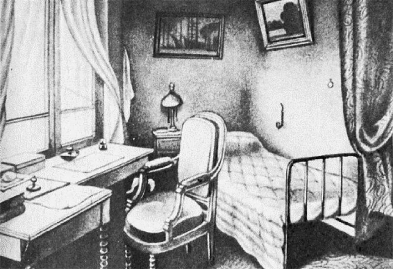 Обстановка самая простая: узкая железная кровать, тяжелое кожаное кресло, большой круглый стол и старая конторка. На ней и писалось все, кроме созданного в каюте «Сен-Мишеля». На каминной полке два бюста: Мольера и Шекспира.