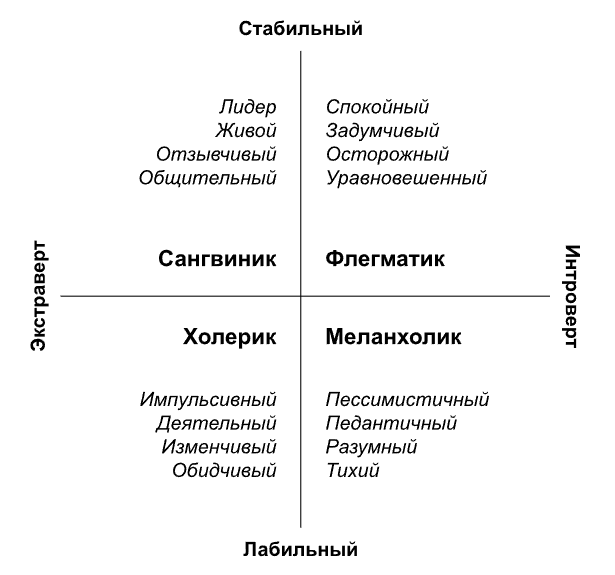 Классическая психология выделяет четыре основных психотипа: сангвиник, холерик, флегматик и меланхолик. Впервые такой подход можно встретить в трудах Гиппократа. В дальнейшем деление людей по четырем темпераментам нашло свое отражение в работах И.П.Павлова, Г.Ю.Айзенка и многих других ученых. Оно основано на анализе двух основных типологических черт: стабильность-лабильность и экстраверт-интроверт (Рис. 2.1).