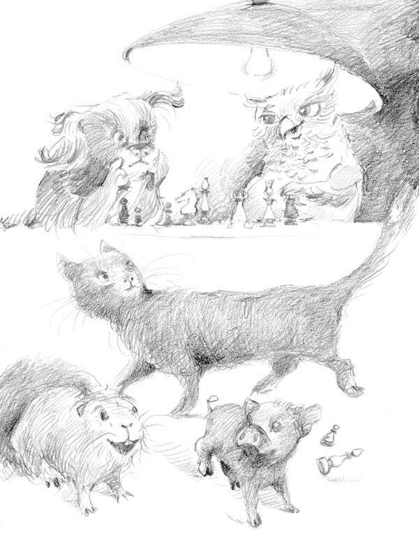 Однажды вечером Тихон вошёл в кают-компанию и замер на пороге. Нора накрывала ужин, как заправский кок. Марыся играла с Бубликом в прятки. Поросёнок прятался под стулом, а морская свинка делала вид, что его не видит. Бегала по каюте и громко кричала: «А где Бублик? Никто не видел Бублика? Куда же он спрятался?» Поросёнок под стулом радостно хрюкал. Сова Владимир Семёнович играл с Вениамином в шахматы. В последнее время оба полюбили эту игру и усаживались за партии каждый вечер. Владимир Семёнович не оставлял попыток собственным примером привить интерес к шахматам Бублику, но тот предпочитал прятки для малышей.