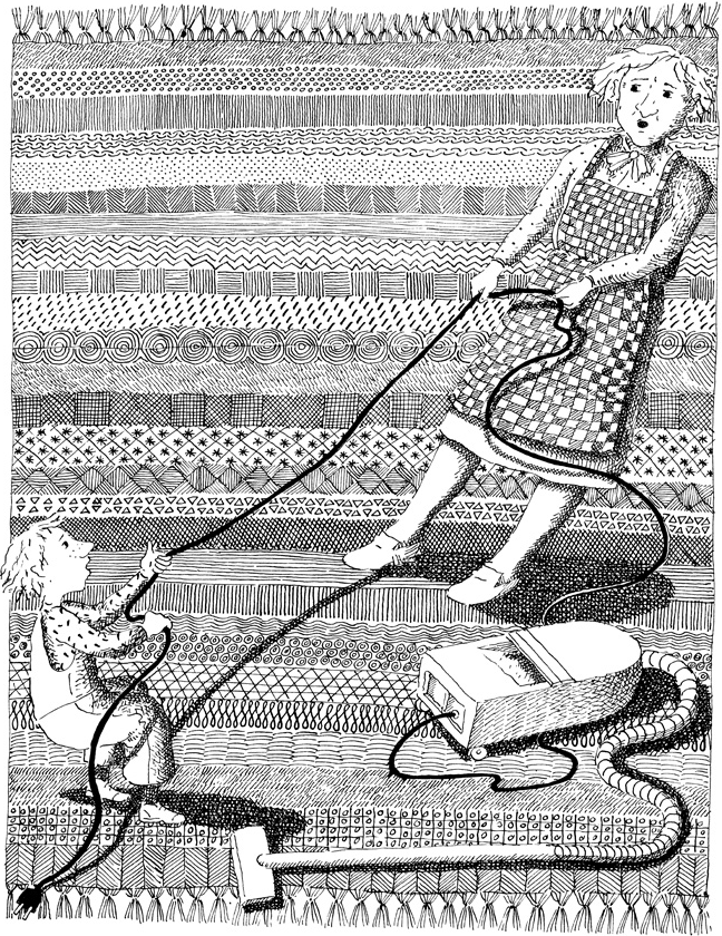 Но на мгновение он отвлекается. А бабушка, одним прыжком добравшись до внука, вырывает шнур у него из рук, снова вставляет вилку в розетку, и пылесос опять жужжит – зур-р, зур-р. Бабушка вновь принимается пылесосить пол, мрачно приговаривая: