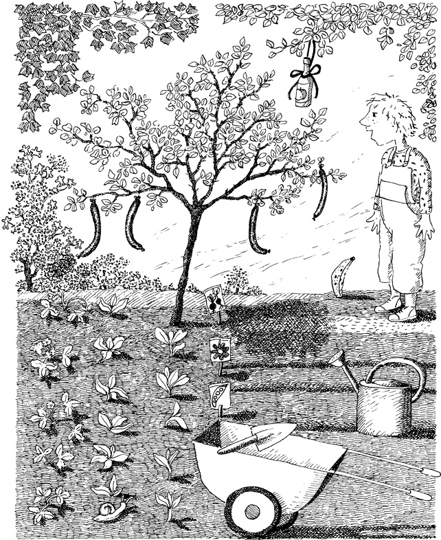 Фридер изумлён. Он ещё никогда такого не видел. Нужно показать банан бабушке, немедленно. Фридер бросается бежать и… снова останавливается. На этот раз около куста, на котором никак не хочет расти крыжовник. Но сейчас на нём вместо ягод висит сосиска! На кусте выросли сосиски! Четыре штуки! У Фридера отваливается челюсть. Потому что он ещё кое-что увидел. Яблоню! На ней, правда, нет ни одного яблока, зато есть яблочный сок! В бутылке, которая висит на самой низкой ветке! А вон там, на живой изгороди, висят мармеладки. Их не меньше двадцати штук, они наколоты на тонкие прутики.