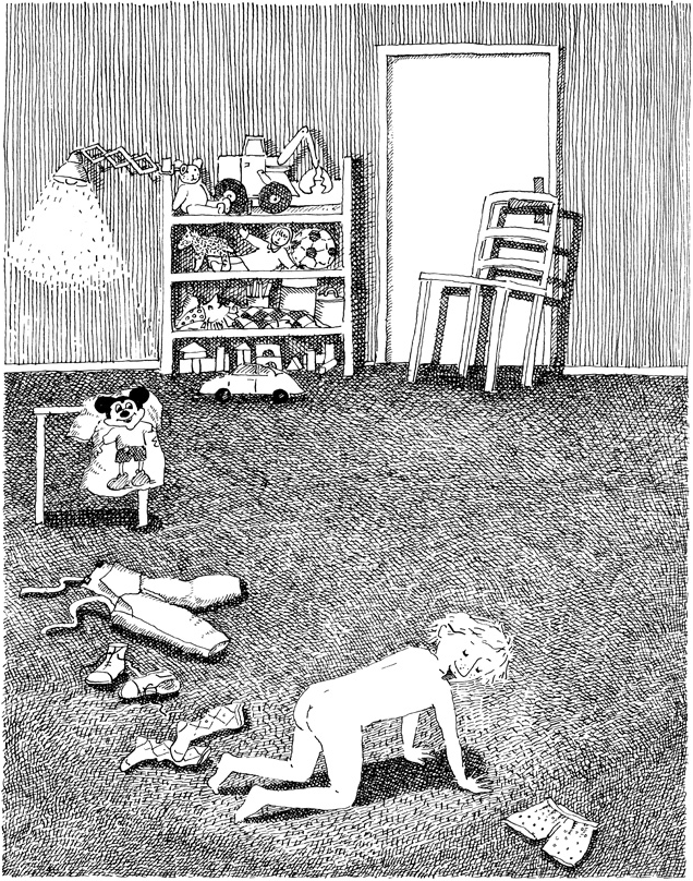 А голова будет чёрного цвета, решает Фридер. Он смешивает краски, а потом долго полощет кисточку, пока вода не становится серой. Вообще-то кисточка слишком тонкая. Остальные кисточки – тоже. Тогда Фридер просто окунает в краску пальцы и рисует ими. На лбу у него выступает пот. Честно сказать, то, что он намалевал на синей рубашке, не слишком похоже на Микки-Мауса.
