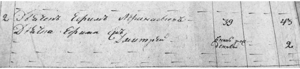 У дьячка Ефима Афанасьева, 43 лет, записан двухлетний сын Дмитрий (женщины писались отдельно на другом листе).