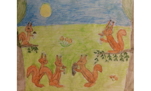 Прыгал бельчонок с веточки на веточку, с деревца на деревце по своим родным и любимым местам в лесу, где было всё знакомо и предсказуемо, пахло свежестью и чудным лесным ароматом грибов и ягод, ярко светило солнышко. Но бельчонка ничего не радовало, он держал путь в неизвестное, не знакомое, чужое место. Бежал он и по полянкам и лугам и вот на одной полянке в зарослях травы бельчонок повстречал ёжика. Он свернулся клубочком, растопырил свои иголочки, только носик чёрный, да глазки бусинки выглядывают. Бельчонок говорит: