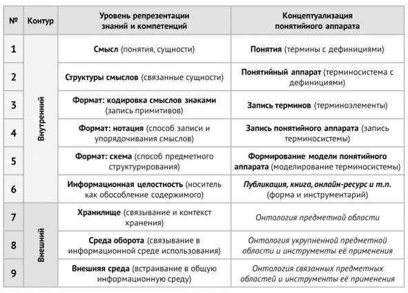 Таблица 1. Концептуализация понятийного аппарата в соответствии с уровнями репрезентации знаний и компетенций.