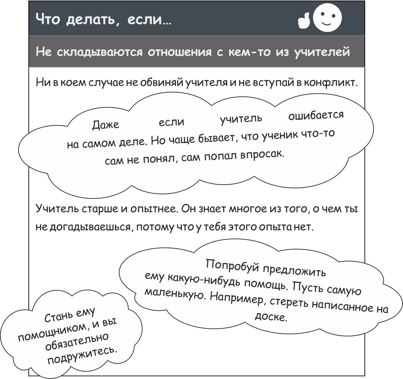 Он исправит твои ошибки в общении с учителями по всем предметам, поможет разобраться с расписанием.