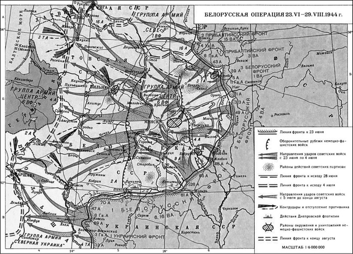 30 мая И.В. Сталин окончательно утвердил план операции «Багратион», которую намечалось начать 19—20 июня. Ее замыслом предусматривались: одновременный прорыв обороны противника на шести участках; окружение и уничтожение его фланговых группировок в районах Витебска и Бобруйска; развитие наступления на Каунасском, Минском и Брестском направлениях с целью завершения разгрома группы армий «Центр» и выхода на рубеж Даугавпилс, Ковно (Каунас), Белосток, Брест, Люблин[38]. По достижении этого рубежа войскам 1-го Прибалтийского фронта предстояло вести наступление на Кёнигсберг и частью сил на Шяуляй, 3-го Белорусского фронта – на Алленштайн (Алленштейн), а 1-го Белорусского фронта – на Варшаву.