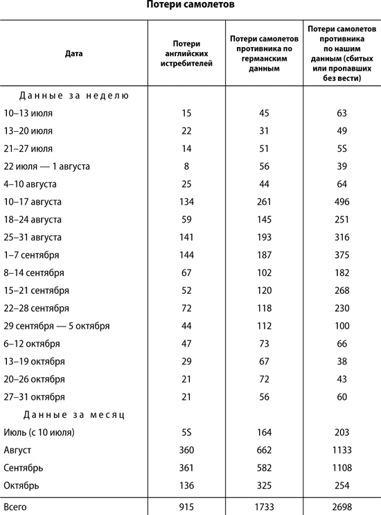 * * *В настоящее время в свете тех данных, которые нам теперь известны, мы можем вполне хладнокровно изучить фактические потери английских и германских военно-воздушных сил в ходе битвы, которая может быть названа одной из решающих мировых битв. Нижеприводимая таблица наглядно отражает наши надежды, опасения и реальное положение дел.