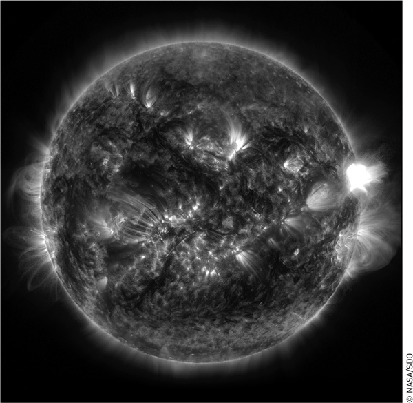 Вспышка на Солнце, зарегистрированная 12 января 2015 года. Этот портрет Солнца в экстремальном ультрафиолете получен аппаратом Solar Dynamics Observatory американского космического агентства.
