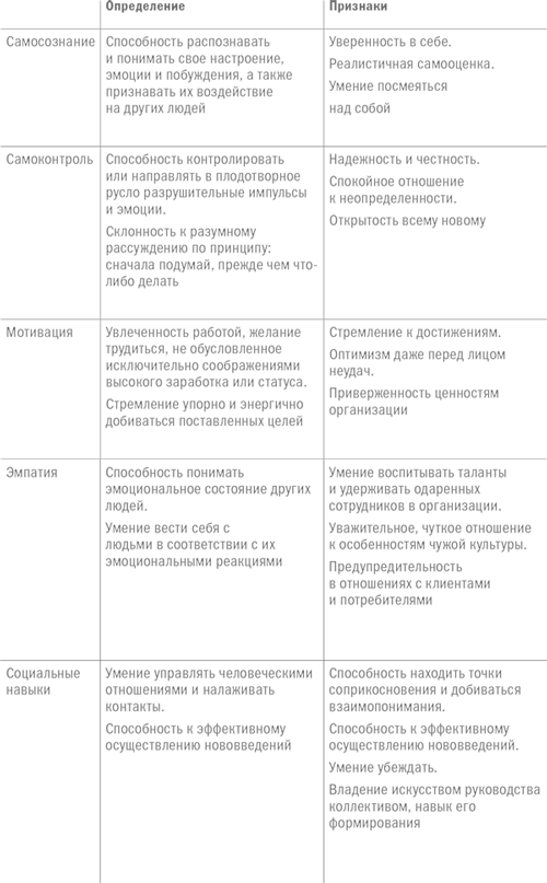 Весь прошлый год мы вместе с коллегами на примере различных организаций тщательно изучали механизмы, лежащие в основе эмоционального интеллекта. Мы анализировали связь эмоционального интеллекта с высокой эффективностью деятельности, особенно на высших уровнях управления; наблюдали, как эмоциональный интеллект проявляется в сфере трудовых отношений. Например: как определить, обладает ли кто-то развитым эмоциональным интеллектом? Как распознать это качество в самом себе? Ниже мы даем ответы на эти и другие вопросы, поочередно рассматривая каждую составляющую эмоционального интеллекта: самосознание, самоконтроль, мотивацию, способность к сопереживанию и социальные навыки.