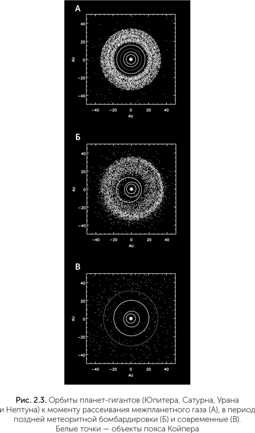 Авторы «модели из Ниццы» начали с попытки объяснить строение пояса Койпера, позднюю тяжелую бомбардировку и согласовать устойчивые конфигурации планет-гигантов с наблюдаемой в реальности, где Юпитер и Сатурн близки к резонансу 5:2 и все расстояния между планетами-гигантами гораздо больше, чем в устойчивых конфигурациях (рис. 2.3).