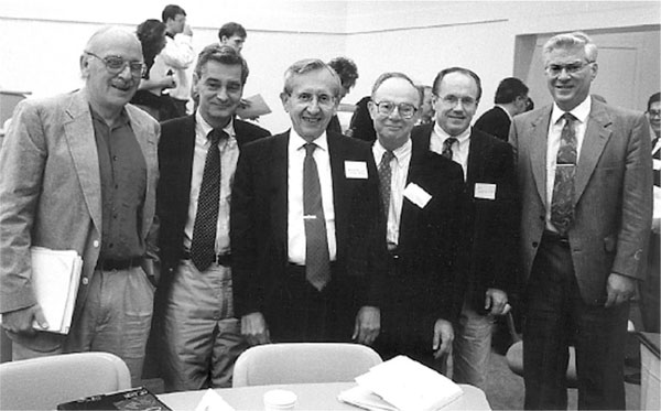 Рис. 2.2. Конференция в Университете Карнеги-Меллона в честь Ричарда Сайерта, 11 сентября 1993 г. Слева направо: Дэвид Касс, Роберт Лукас, Алан Мельтцер, Эдвард Прескотт и Тимоти Магуайр