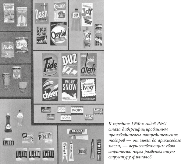 Эти интуитивные соображения породили идею об образовании в компании трех подразделений, каждое из которых развивало бы свое направление бизнеса. Моргенс действовал быстро, понимая, что может встретить сопротивление со стороны влиятельных руководителей производственного департамента и департамента продаж, перед которыми замаячила перспектива понижения до уровня рядовых управленцев. В 1955 году производство мыла, синтетических моющих средств и пищевых продуктов сформировали три направления бизнеса компании; отделение лекарственных средств было переквалифицировано в отделение туалетных принадлежностей. (Когда Моргенс возглавлял это отделение, его тактика создания внутренних мини-подразделений с собственными руководителями была успешной. Поэтому, проводя реорганизацию компании, он опирался на эту модель.) Каждое направление имело теперь своего руководителя, отвечающего за деятельность отделения в целом. Функции центрального аппарата компании были распределены таким образом, чтобы координировать деятельность конкретных отделений, включая отделения фундаментальных исследований, инженерное отделение, отделения, отвечающие за взаимодействие с рекламными агентствами и СМИ, а также контролирующие деятельность по распространению образцов и продвижению товара с использованием купонов{154}.