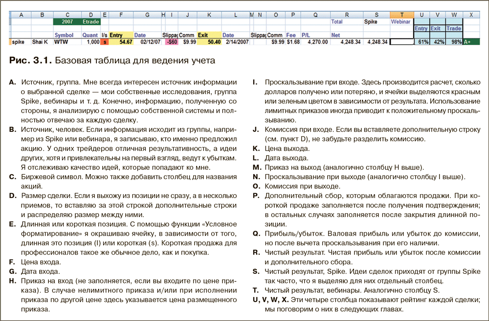 При общении с трейдерами меня удивляет, что мало кто из них ведет учет результатов сделок в электронных таблицах. Многие полагаются на брокеров, но их выписки не имеют необходимой детализации. Поэтому я рекомендую самостоятельно записывать результаты в электронную таблицу. Моя компания, www.elder.com, предлагает такую таблицу (рис. 3.1) бесплатно. Вы можете запросить ее по электронной почте, направив письмо в адрес info@elder.com.
