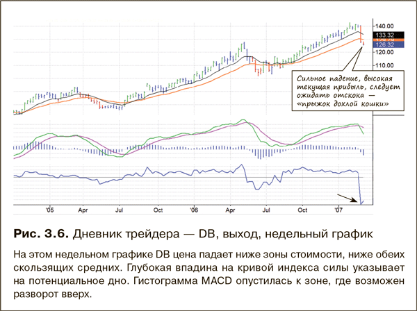 На недельном графике DB (рис. 3.4) указан источник идеи этой сделки – электронное письмо от друга, который провел несколько рыночных сканирований и поделился со мной результатами. Наклонные красные стрелки указывают на медвежьи расхождения. Вертикальные стрелки показывают, где акция резко падает. Есть также ремарка с упреком за излишнюю торопливость при входе. Настроение у меня было слишком медвежьим, к тому же покоя не давала упущенная накануне сделка, идею для которой принес мой собственный поиск.