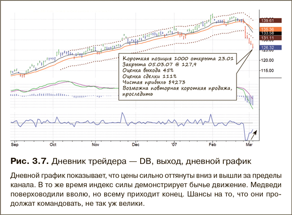 Дневной график DB (рис. 3.5), приведенный ниже, показывает больше медвежьих расхождений и ложный прорыв вверх (очень сильный торговый сигнал). Он документирует мой вход в сделку и оценку качества двух моих приказов на продажу по 100-балльной шкале. Графики помогают мне сегодня вспомнить эту сделку и вынести из нее полезный опыт. Что я сделал правильно? Что я сделал неправильно? Можно ли повысить качество входа в сделку?