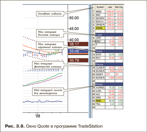 Составив план для акции, добавьте ее биржевой символ, или тикер в список для мониторинга в окне программы, которую вы используете для анализа рынка. Размер компьютерного экрана ограничивает размер окна, и это хорошо. Я слежу только за теми акциями, которые умещаются на одном экране, не распыляя внимание между десятками тикеров. Я предпочитаю, чтобы в окне (рис. 3.8) отображались основные рыночные индексы, такие как S&P 500, и отдельные секции с моими длинными, короткими и фьючерсными позициями. Нижнюю секцию я называю Monitor и размещаю в ней перспективные акции.