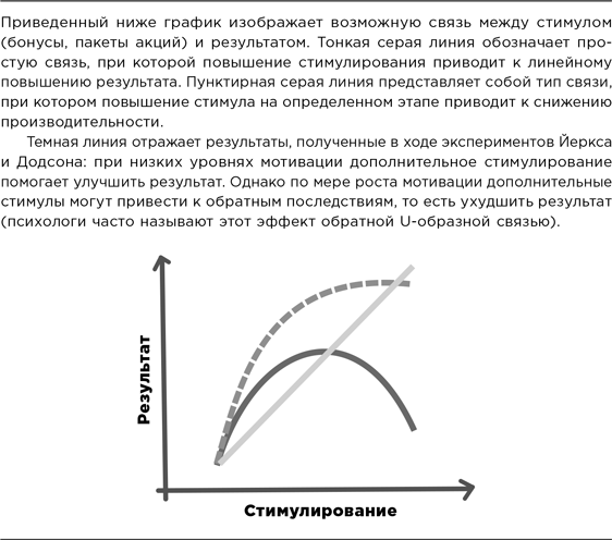 Мы склонны достаточно быстро делать предположение о связи силы воздействия и способности к улучшению нашей работы. Кажется вполне разумным, что чем больше мы мотивированы что-то сделать, тем упорнее движемся к своей цели, и рост наших усилий, вне всякого сомнения, приближает нас к ней. Именно в этом отчасти и состоит смысл огромных бонусов, выплачиваемых фондовым брокерам и генеральным директорам компаний, – предложенный людям огромный бонус мотивирует их к высококачественной работе.