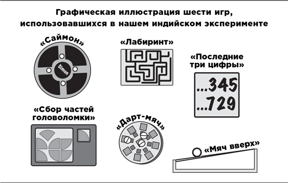 Следующей была игра «Сбор частей головоломки», затем пришел черед вспомнить последние три цифры. После этого Нитин сыграл в «Лабиринт», «Дарт-мяч» и, наконец, в «Мяч вверх». К концу первого часа ему удалось достичь очень хорошего результата по двум играм и хорошего – по двум другим. Однако еще по двум играм ему не удалось получить даже хорошего результата. В итоге, заработав 120 рупий – немногим более величины недельного заработка, он вышел на улицу вполне довольный собой.