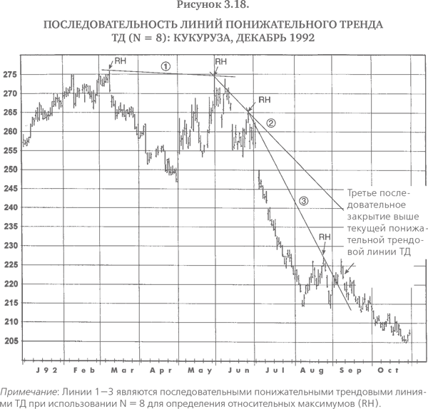 Определение трендовых линий исходя из самых последних относительных максимумов и минимумов позволяет постоянно корректировать линии тренда по мере появления новых относительных максимумов и относительных минимумов. Например, рис. 3.17 демонстрирует последовательность повышательных трендовых линий ТД, которые были построены вслед за появлением новых относительных минимумов (при N = 10) вплоть до получения сигнала о развороте тренда. На этом графике сигнал разворота тренда определяется как три последовательных закрытия ниже действующей повышательной трендовой линии. Аналогичным образом рис. 3.18 иллюстрирует последовательность понижательных трендовых линий ТД, построенных по относительным максимумам (при N = 8) вплоть до получения сигнала о развороте тенденции (также определяемого как три последовательных закрытия за пределами линии тренда).