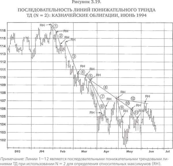 Различные значения N приводят к весьма разным трендовым линиям. Например, на рис. 3.19–3.21 представлены различные понижательные линии тренда ТД, полученные на одном и том же графике при использовании трех разных значений N. Чем ниже значение N, тем чаще корректируется понижательная линия тренда и тем она более чувствительна к пробою. Сравните, например, дюжину трендовых линий, полученных при N = 2, и всего лишь три линии, когда использовалось значение N = 10.