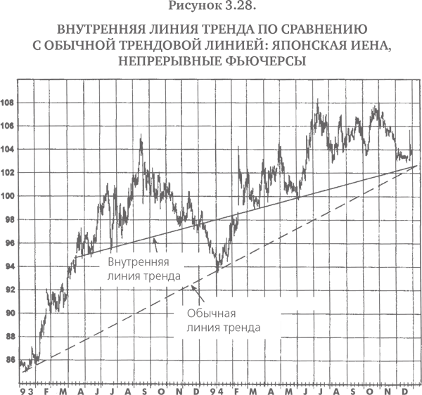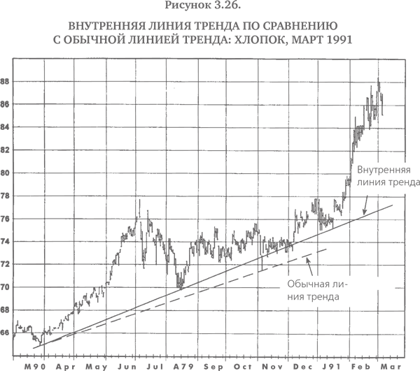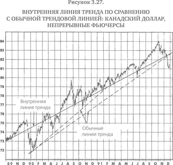 Стандартные линии тренда обычно проводятся через ценовые экстремумы (т. е. максимумы или минимумы). Однако существует мнение, что экстремальные цены соответствуют кратковременным движениям рынка, связанным с избытком эмоций у участников торгов, и что поэтому данные точки могут не соответствовать реальной тенденции рынка. Внутренние линии тренда позволяют обойти молчаливо подразумеваемое требование о проведении трендовых линий через экстремальные точки графика. Внутренняя линия тренда проводится максимально близко к большинству относительных максимумов или относительных минимумов и при этом игнорирует экстремальные точки. Иначе говоря, внутреннюю линию тренда можно представить как линейную аппроксимацию точек относительных максимумов или относительных минимумов. На рис. 3.26–3.37 представлен широкий спектр примеров внутренних повышательных и понижательных трендовых линий, охватывающих графики отдельных контрактов, дневные графики непрерывных фьючерсов и недельные графики ближайших фьючерсных контрактов. Для сравнения на этих графиках показаны также обычные линии тренда[4], изображенные в виде пунктирных линий.
