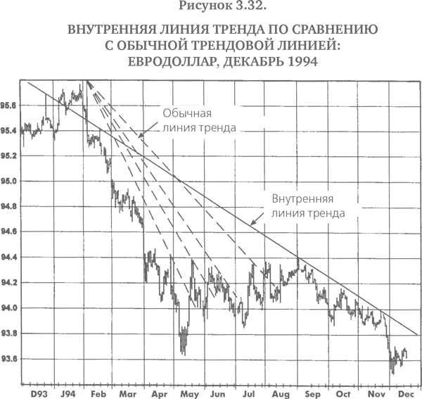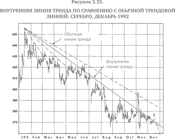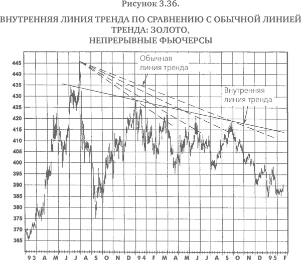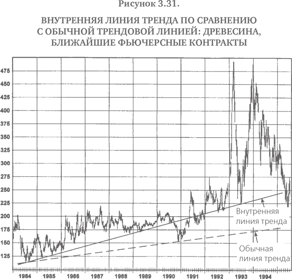 Тот факт, что лично я считаю внутренние линии тренда намного более полезными, чем обычные линии тренда, ничего не доказывает – любопытные наблюдения отдельного индивидуума вряд ли могут служить научным доказательством. На самом деле, принимая во внимание субъективный характер внутренних трендовых линий, было бы очень трудно провести научное тестирование их надежности. Тем не менее моя точка зрения состоит в том, что внутренние линии тренда – это то, что серьезному графическому аналитику, безусловно, следовало бы использовать в работе. Я уверен, что, занимаясь этим, многие читатели также придут к выводу, что внутренние линии тренда намного эффективнее обычных трендовых линий или по крайней мере служат полезным дополнением к инструментарию графического аналитика.