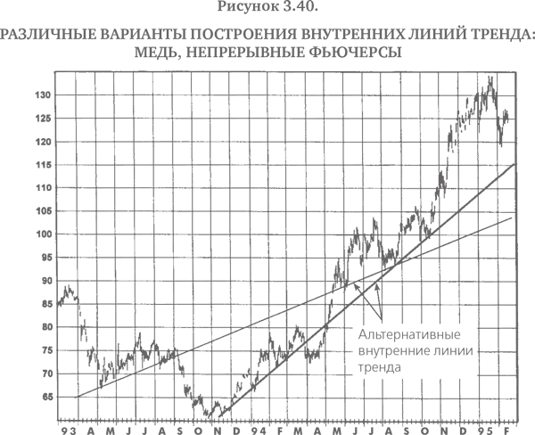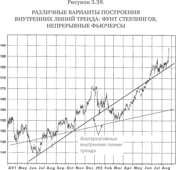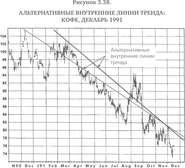 Одним из недостатков внутренних трендовых линий является их неизбежная произвольность, возможно, даже большая, чем у обычных трендовых линий, которые по крайней мере фиксируются крайними максимумами или минимумами. В действительности нередко имеется несколько вариантов проведения внутренней линии тренда на графике (рис. 3.38–3.40). Тем не менее мой опыт свидетельствует, что внутренние линии тренда гораздо полезнее обычных трендовых линий в нахождении потенциальных зон поддержки и сопротивления. Анализ рис. 3.26–3.37 показывает, что внутренние линии тренда, изображенные на этих графиках, в целом лучше указывают, где рынок удержался бы при падениях и остановился бы при взлетах цен, чем это делают обычные линии тренда. Конечно, данный ряд примеров не доказывает превосходства внутренних трендовых линий над обычными, поскольку всегда можно найти графики, которые внешне могут подкрепить практически любую точку зрения, и подобное доказательство здесь, разумеется, не предполагается и не подразумевается. Сравнения, приведенные на этих графиках, направлены скорее на то, чтобы дать читателю почувствовать, что внутренние линии тренда могут лучше указывать на потенциальные области поддержки и сопротивления.