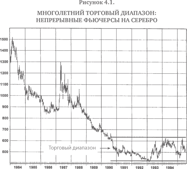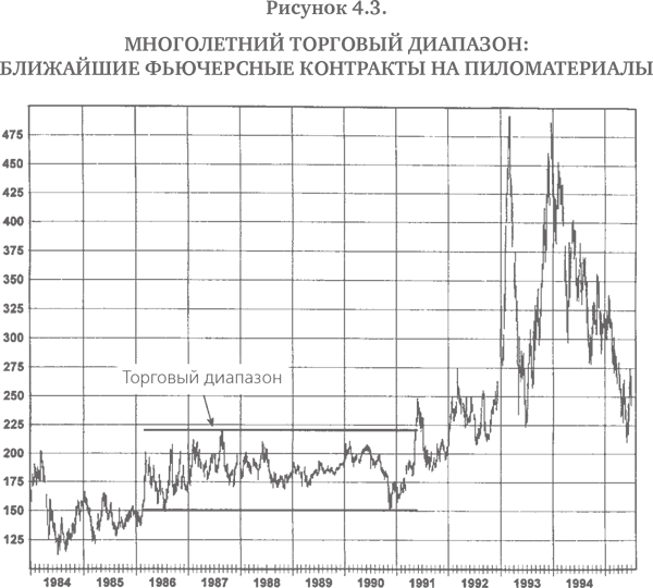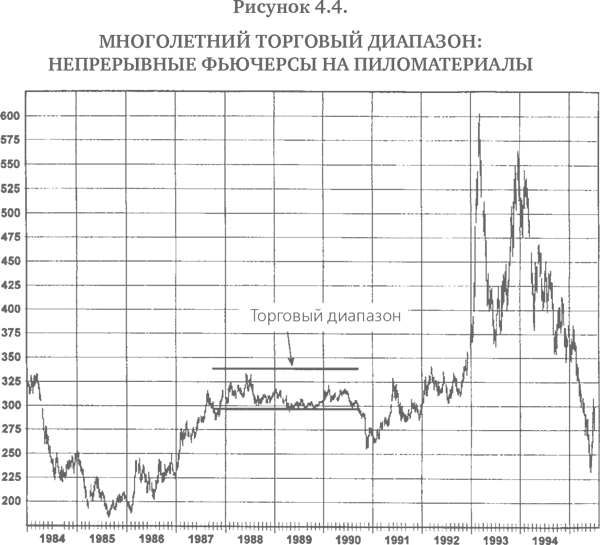 Торговые диапазоны часто могут длиться годами. Например, ко времени написания этой книги рынок серебра находился в торговом диапазоне уже четыре года (рис. 4.1). На рис. 4.2 изображен четырехлетний торговый диапазон на рынке соевой муки. Рис. 4.3 и 4.4 показывают многолетние торговые диапазоны на рынке пиломатериалов. Заметьте, что на двух последних иллюстрациях длительность торговых диапазонов различна для ближайших и непрерывных фьючерсов, хотя обычно они ведут себя почти синхронно.