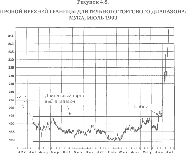 1. Продолжительность торгового диапазона. Чем больше продолжительность торгового диапазона, тем потенциально более значительны масштабы будущего пробоя. Этот тезис иллюстрируется на примере недельного (рис. 4.7) и дневного (рис. 4.8) графиков.