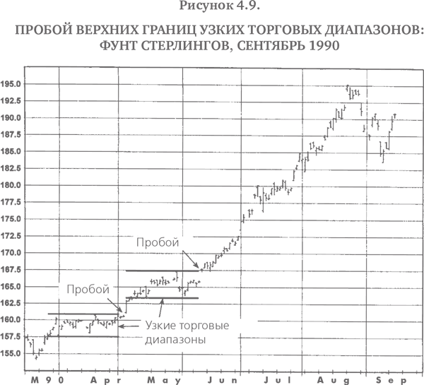 2. Узость диапазона. Пробои из узких диапазонов дают, как правило, особенно надежные сигналы к торговле (рис. 4.9 и 4.10). Более того, такая торговля может быть исключительно привлекательной, поскольку обоснованные защитные остановки предполагают сравнительно низкий денежный риск.