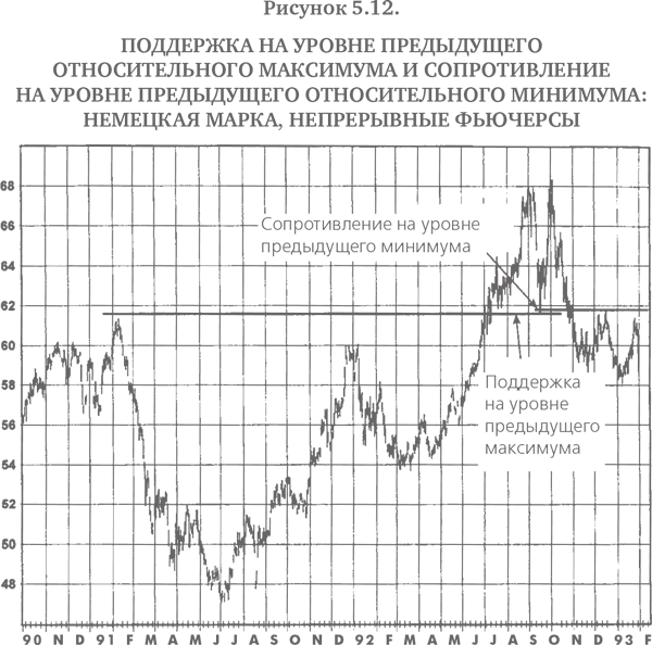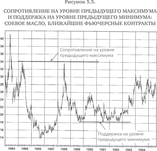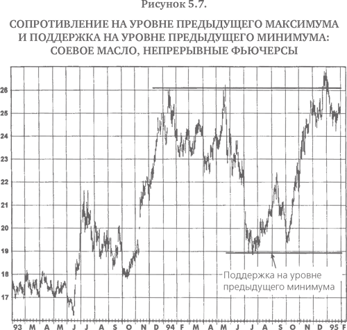 Обычно сопротивление возникает на уровне предыдущих важных максимумов, а поддержка – на уровне важных минимумов. Каждый из рис. 5.5–5.7 иллюстрирует обе модели поведения. Например, на рис. 5.5 обратите внимание на то, что крупный пик 1988 г. образовался как раз под максимумом 1985 г., тогда как минимум 1989 г. заложил уровень поддержки для минимумов 1991 и 1992 гг. На рис. 5.6 минимум в конце 1990 г. установился как раз под уровнем дна 1986 г., тогда как разворот 1992 г. сформировался над уровнем пика начала 1989 г. Хотя концепция сопротивления вблизи уровня прошлых вершин и поддержки вблизи уровня прошлых минимумов, возможно, особенно важна для недельных графиков, таких как на рис. 5.5 и 5.6, этот принцип применим и к дневным графикам (рис. 5.7). Обратите внимание, что на этом графике развороты цен в мае и декабре 1994 г. произошли как раз над уровнем пика в январе того же года, а минимум в октябре находился чуть выше июльского минимума.