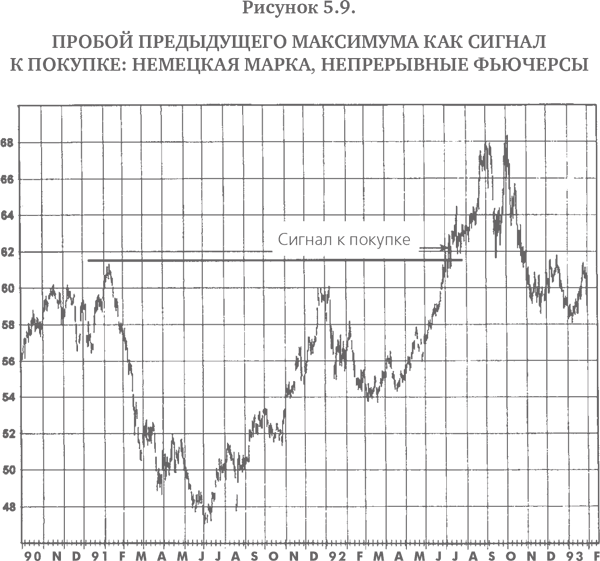 Пробой вверх предыдущего максимума может рассматриваться как сигнал к покупке, а пробой вниз предыдущего минимума – как сигнал к продаже. Однако так же, как и в случае пробоя границ торговых диапазонов, для того чтобы использовать пробития максимумов и минимумов в качестве сигналов к торговле, они должны отвечать некоторым минимальным требованиям (по глубине пробоя в ценовом выражении или по временной продолжительности). Так, например, из предыдущего комментария относительно графиков на рис. 5.6 и 5.7 должно быть понятно, что незначительный, в рамках одного периода (одного дня для дневных графиков, одной недели для недельных графиков) пробой предшествующего максимума или минимума еще ничего не доказывает. Необходимо более веское подтверждение, нежели простой пробой предыдущего максимума или минимума, чтобы допустить, что подобное развитие событий является сигналом к покупке или продаже. Примерами возможных условий подтверждения могут служить минимальное число закрытий за пределами предыдущего максимума или минимума, минимальное процентное изменение цены после пробоя или оба условия.
