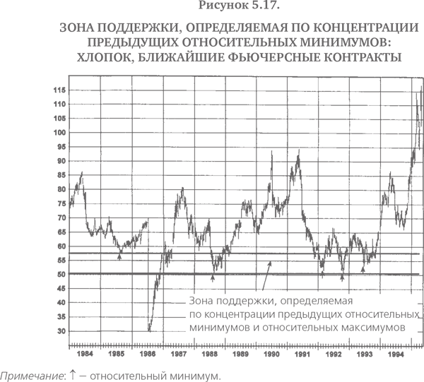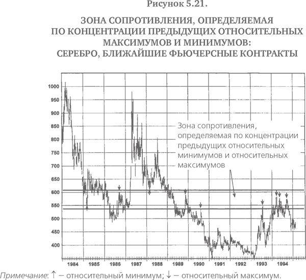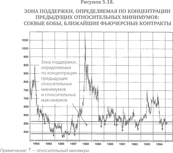 В предыдущем параграфе шла речь о поддержке и сопротивлении на уровне предшествующих отдельных максимумов и минимумов. В данном параграфе анализируются поддержка и сопротивление в ценовых зонах с концентрацией относительных максимумов и относительных минимумов, а не с наличием абсолютных вершин и впадин. В частности, относительные максимумы и минимумы нередко приходятся на сравнительно узкую ценовую зону. Эти зоны являются потенциальной областью поддержки, если текущие котировки находятся выше, и сопротивления, если текущие котировки ниже. Указанный метод особенно полезен при прогнозировании областей поддержки и сопротивления на долговременных графиках. На рис. 5.15–5.19 показаны недельные графики с примерами поддержки на уровне предыдущих концентраций относительных максимумов и минимумов. На рис. 5.20–5.21 зоны концентраций относительных максимумов и минимумов являются ценовыми сопротивлениями.