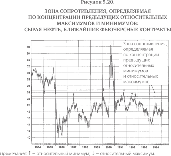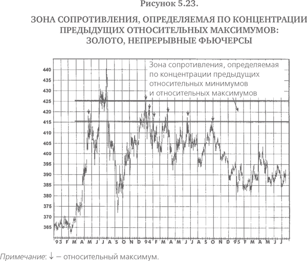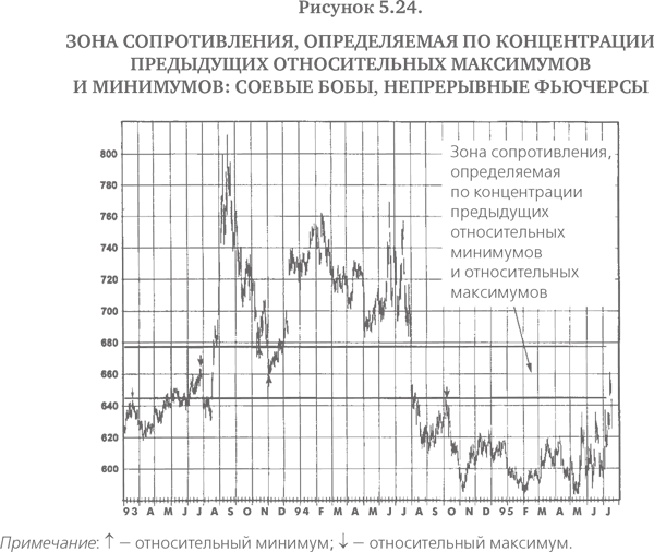 Метод, опирающийся на концентрацию предыдущих относительных максимумов и минимумов с целью определения поддержки и сопротивления, может быть применен также и к дневным графикам непрерывных фьючерсов достаточной продолжительности (например, два года). (Жизненный цикл большинства графиков индивидуальных контрактов является слишком коротким для эффективного использования данного метода.) Например, рис. 5.22–5.24 показывают дневные графики непрерывных фьючерсов с зонами сопротивления, определяемыми по предыдущим относительным максимумам и минимумам.