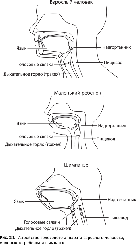 Когда обезьян пытались обучить человеческому языку, довольно быстро стало понятно, что они при всей своей сообразительности не могут освоить членораздельную звучащую речь. Максимум их достижений – это слова mama – ‘мама’, papa – ‘папа’ и cup – ‘чашка’123. Связано это прежде всего с тем, что по сравнению с человеком у обезьян (в частности, у шимпанзе) слишком высоко расположена гортань. И это очень удобно, поскольку позволяет есть и дышать практически одновременно. Низкое же положение гортани открывает возможности для четкого произнесения звуков человеческого языка, но при этом создает риск подавиться. Как пишет Стивен Пинкер, «до недавнего изобретения приема Геймлиха попадание еды в дыхательные пути было шестой лидирующей причиной смерти от несчастного случая в Соединенных Штатах, уносившей шесть тысяч жизней в год»124.