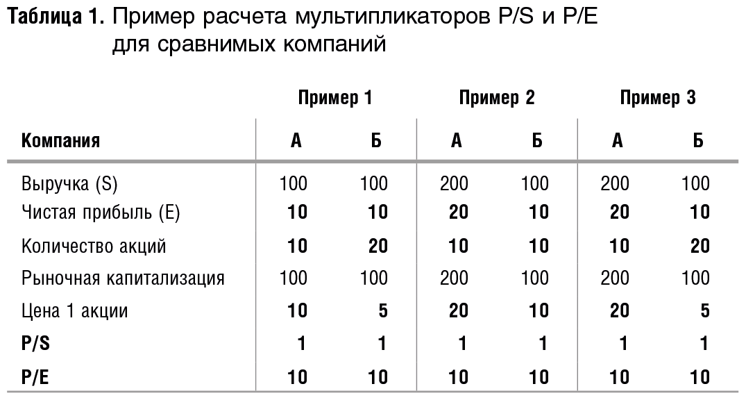 ■ если компании отличаются друг от друга только по количеству акций (пример 1), то величины их P/S и Р/Е совпадают;