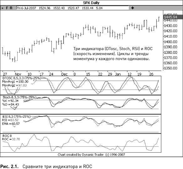 В чем суть этого сравнения? Большинство основанных на цене индикаторов показывают примерно одно и то же, т. е. что циклы моментума совершаются и вызывают ответную реакцию примерно в одно и то же время. Параметры настройки любого индикатора, включая ретроспективный период, можно подстраивать для различных рынков и таймфреймов так, чтобы получать наиболее надежные сигналы. Но, как вы можете судить по рис. 2.1, даже без подстройки параметров все индикаторы отражают циклы моментума одинаково хорошо. Далее в этой главе вы узнаете, как выбрать лучшие параметры настройки любого индикатора для любого рынка и таймфрейма.