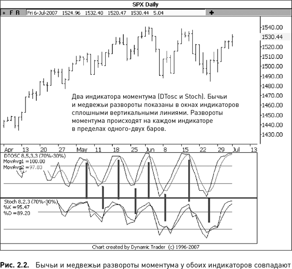 Рис. 2.2 представляет собой другой скриншот. На нем только два индикатора – Stoch и DTosc – и меньше данных, поэтому циклы моментума видны более отчетливо. Я начертил в окне индикаторов толстые вертикальные линии там, где происходит каждый бычий и медвежий разворот моментума, т. е. где быстрая линия пересекает медленную линию.