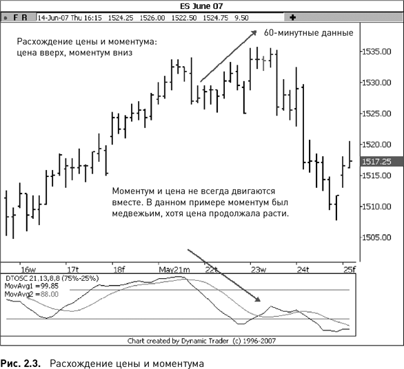 На рис. 2.3 показаны 60-минутные данные ES-0607. Я пометил расхождение между ценой и моментумом стрелками.