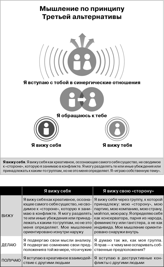 Третья альтернатива всегда начинается с «Я». Она разворачивается изнутри наружу, из самых потаенных глубин человеческой личности, начинаясь с фундамента, составленного из уверенности в себе и смирения. Она развивается из парадигмы самосознания, позволяющей взглянуть на себя со стороны и оценить собственные предубеждения и склонности. Она исходит из признания того факта, что я сам пишу свою историю, и из готовности при необходимости ее переписать – ведь я хочу, чтобы она окончилась хорошо.